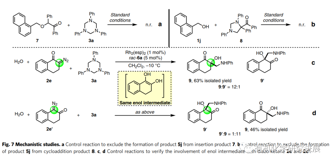 首先,該作者選擇以1,3,5-三芳基-1,3,5-三嗪3a作為甲醛亞胺的前體,在銠(II)/磷酸共同催化下優化不同的重氮酮和芐醇1a的三組分反應。控制實驗表明Rh(II)和CPA都是必不可少的。當缺少CPA時,檢測不到三組分反應的產物,相反2a和3a的[4+1]環加成反應成為了主反應。 在得到最優反應條件之后,作者首先對芐醇的底物范圍進行了探究。結果表明芐醇底物的位阻比電子密度對反應的對映選擇性有更大的影響。進一步增加醇化合物的位阻導致無法得到目標產物,這表明轉化的發生和位阻之間存在一個嚴格的平衡。 三嗪的底物范圍較廣,電子效應和位阻效應在對映選擇性方面不明顯。 由于手性β-氨基-α-羥基酮有很好的合成潛力,作者又繼續擴大醇的底物范圍。烷基醇、烯丙醇和炔丙醇也能順利的反應,其中烯丙基和炔丙基有利于進一步衍生化β-氨基酮。該方法還可以對各種天然產物的醇類化合物進行后期修飾。 商品化藥物的修飾和兩個藥物結構的連結對于發現新的藥物分子有很大的作用。利用該策略將抗HIV藥物Darunavi和膽固醇連結,能高產率和非對映選擇性的生成新化合物4m。更驚奇的是,水也可以作為親核試劑參與反應生成手性β-氨基-α-羥基酮。 為了探究該反應的機理,作者進行了兩個控制反應。首先,在標準條件下,將單獨制備的O-H插入產物7 與3a進行反應,該反應無法進行。這個結果表明該轉化不是經歷O-H插入/曼尼希反應的分步路徑。另一方面,作者將只使用銠(II)催化劑時生成的[4+1]環加成產物8,在標準條件下與1j反應,該反應同樣無法進行。因此也排除了8作為轉化反應中間體的可能。 此前已有報道提出烯醇中間體是α-重氮酮和醇的O-H插入和重排反應的關鍵中間體,相關的DFT計算也支持了這一可能。為了證明烯醇是否能參與本轉化,作者分別使用2-重氮-1-四氫萘酮和1-重氮-2-四氫萘酮進行了平行反應,都得到相同的主產物,這表明了是烯醇中間體而不是氧鎓參與了該轉化。 總結,在銠(II)/手性磷酸催化下,胡課題報道了一種由α-重氮酮、1,3,5-三嗪、醇三組分參與的不對稱催化反應。通過甲醛亞胺的親電不對稱活化實現不對稱胺甲基化反應,合成一系列手性β-胺-α-羥基酮化合物。各類的醇包括簡單的脂肪醇,復雜的天然產物醇和水都可以進行反應,反應的效率高且對映選擇性好。