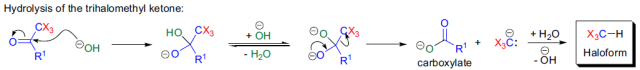 由上述反應機理可以看出,反應中氫氧化鈉除了作為堿外,還作為親核試劑。如果使用其它堿,使反應在無水條件下進行,則反應生成的鹵仿碳負離子可作為親核試劑與其它親電試劑反應,這是Langlois建立的三氟甲基化方法。