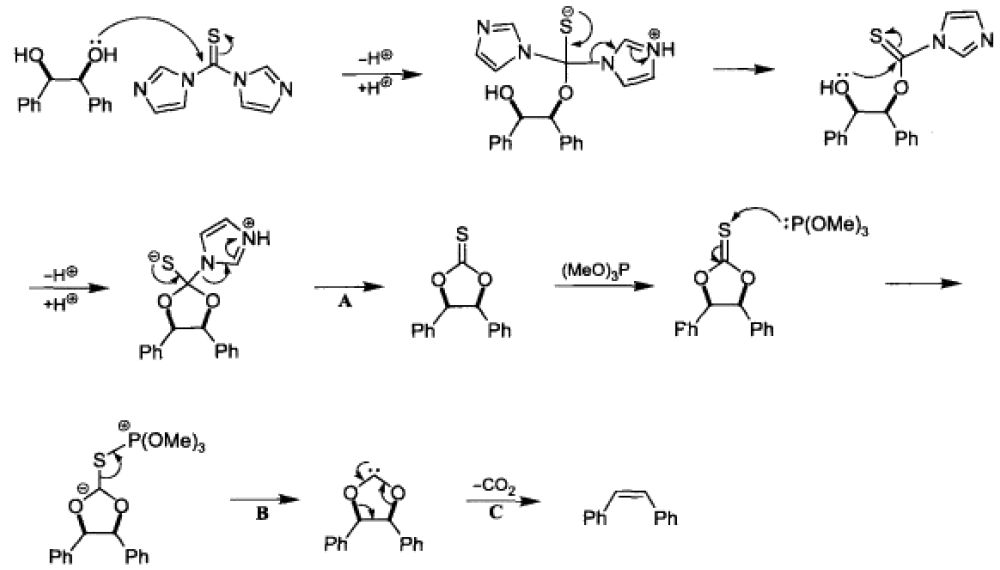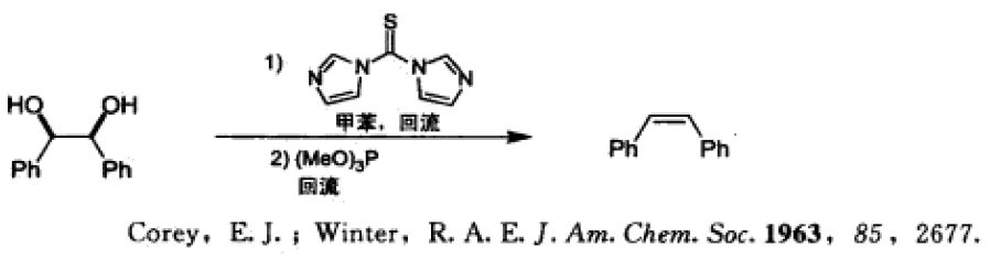 反應說明:該反應為Corey-Winter烯烴合成反應,是順式鄰二醇被羰基二咪唑還原生成順式烯烴的反應