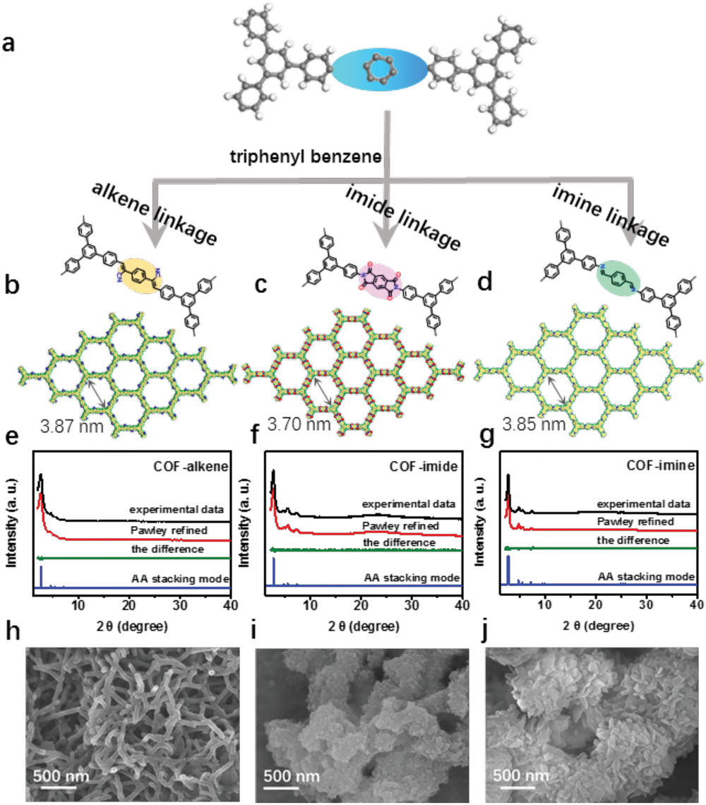 共價有機骨架(COFs)是一種潛在的人工光合作用光催化劑,但人們在光催化析氫(PHE)方面的研究較少。同時, COFs由于其結晶性、可調諧性和孔隙率等優點而備受關注,但其表觀量子效率(AQE)較低,而對原子結構與性能的相關性研究甚少。為此, 中山大學余丁山教授課題組近日在國際知名期刊Advanced Materials上發表了題為“Alkene‐Linked Covalent Organic Frameworks Boosting Photocatalytic Hydrogen Evolution by Efficient Charge Separation and Transfer in the Presence of Sacrificial Electron Donors”的研究文章, Chunshao Mo是本文的第一作者。 本文以三苯結和苯基連接物為概念證明,構造了三種不同連接結構的COFs,實現了COFs平臺的可調,并探討了連接化學對PHE的影響。氰基取代的烯烴連接的COF(COF-烯烴)在可見光照射下產生穩定的2330μmol h-1 g-1 PHE速率,遠優于亞胺和酰亞胺連接的對應物(<40μmol h-1 g-1)。而且,COF-烯烴在420納米處的AQE達到6.7%。結合飛秒瞬態吸收光譜和理論計算,揭示了氰基取代烯烴鍵在犧牲電子供體存在下對高效電荷分離和轉移的關鍵作用,這是獲得優異PHE性能的決定性關鍵。這種烯鍵還可以擴展到設計一系列高性能的高分子光催化劑,突出了高效PHE的普遍設計思路。烯烴鍵, 電荷分離, 電荷轉移, 共價有機骨架, 光催化通過將太陽能轉化為氫能進行人工光合作用是解決全球環境和能源問題的一項具有吸引力和可持續性的戰略。有機半導體由于其合成可調性和可調性,被認為是光催化太陽能制氫或水分解的有效催化劑。人們已經對氮化碳、共軛微孔聚合物、線性共軛聚合物、和共價三嗪框架作為水分解的光催化劑進行了研究。但是,它們通常是非晶態或半晶態的,限制了光生電荷向催化劑表面的傳輸。因此,建立原子結構-性能關聯仍然是一項具有挑戰性的任務。近年來,共價有機框架(COFs)因其具有長程有序性、寬集光性、有時載流子遷移率高、穩定性好等優點,成為人工光合作用中一種很有前途的光活性材料太陽光譜區域(450–700納米)。然而,盡管存在巨大的潛力,但光催化析氫(PHE)的開發卻少得多,這些報道的COFs仍存在不令人滿意的表觀量子效率(AQE)(420 nm時為0.1–4.8%),阻礙了其光催化潛力的發展。最近,一些研究小組通過C-C鍵開發了一些sp2碳共軛COFs,這使得能夠實現全π共軛,對于光電子和電化學來說是很理想的。然而,由于合成困難,sp2碳鍵COFs在PHE中的研究到目前為止只有兩例。為了構建先進的COF基水分解光活性材料,先前的研究策略主要集中在具有特定連接的結或連接物的分子設計上。例如,一些異核分子功能,如砜、三嗪或七嗪基單元或二乙酰基部分被并入結或連接物中,以有效地調節COFs的物理化學性質,從而促進PHE。在本文中, 作者將連接化學的原理合理的應用于COF基光觸媒中, 鍵合關系往往決定COFs的化學穩定性和電子通訊性,這對光化學過程具有重要意義。此外,COFs中的光激發電荷轉移對光催化有著至關重要的作用,但對它的動力學還缺乏清晰的認識。作者建立了以三苯為結、苯基為連接劑、不同連接方式的可調諧COF平臺,并闡明了連接化學在可見光催化中的作用。幾種結構相關COFs的系統性質變化表明,鍵合化學能有效地調節COFs的結構和光電性質,從而調節PHE的活性。得到了苯丙氨酸(PHE)活性的變化趨勢:COF-烯烴>COF-酰亞胺>COF-亞胺。COF-烯烴在420 nm處產生6.7%的AQE,且與酰亞胺和亞胺連接的對應物相比(小于40μmol h-1 g-1),其PHE速率顯著提高(2330μmol h-1)。 盡管COF-烯烴的AQE仍然低于一些最先進的共軛多孔聚合物PHE催化劑的AQE,通過在連接物中引入異核分子功能之后, 烯烴連接的COF的PHE活性仍然具有很大的提高空間。組合的fs-TA光譜和理論計算揭示了氰基取代烯烴鍵對高效電荷分離和轉移的重要作用,特別是在犧牲電子供體存在的情況下,犧牲電子供體具有很強的吸電子能力和電子離域能力,這是COF-烯烴具有優異PHE性能的關鍵。烯烴鍵還可以用來設計一系列具有高苯丙氨酸活性的共軛聚合物。本研究的發現為連鎖化學和光化學事件之間的關系提供了一些基本的見解, 強調了合理設計先進的太陽能-燃料轉化聚合光催化劑的一般準則。a) Chemical structure of three COFs with different linkages.b–d) Simulated crystal structure of many layers of COF–alkene, COF–imide, and COF–imine, respectively.PXRD patterns of e) COF–alkene, f) COF–imide, and g) COF–imine.SEM images of h) COF–alkene, i) COF–imide, and j) COF–imine, respectively.https://onlinelibrary.wiley.com/doi/10.1002/advs.201902988