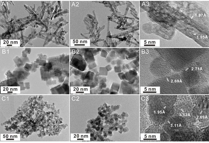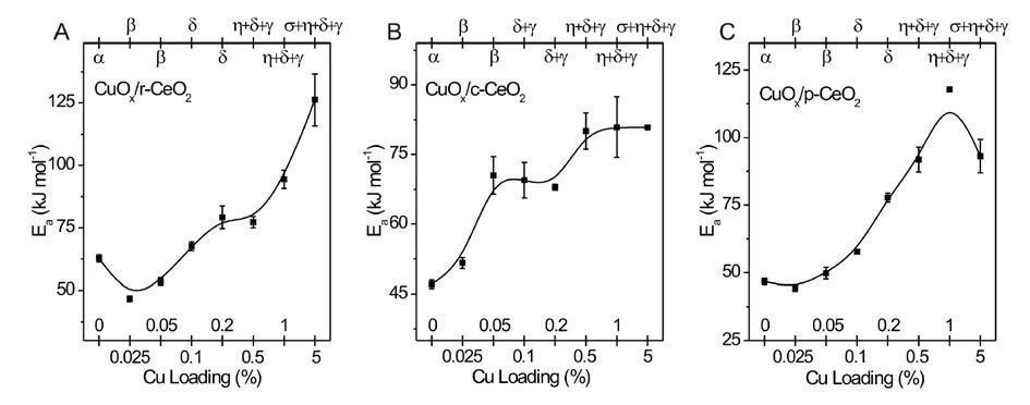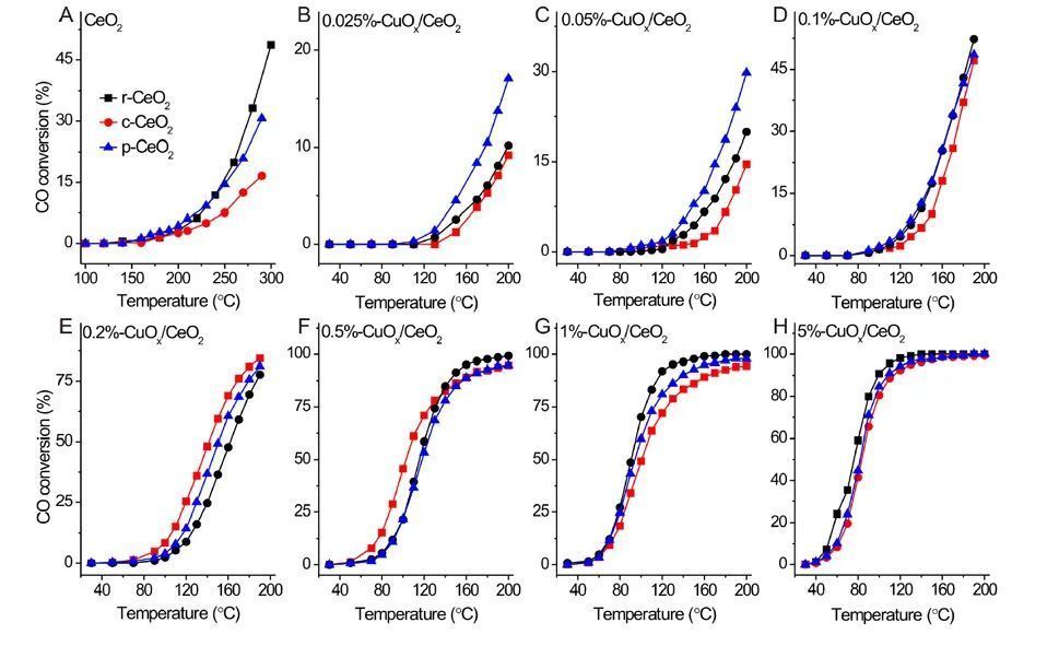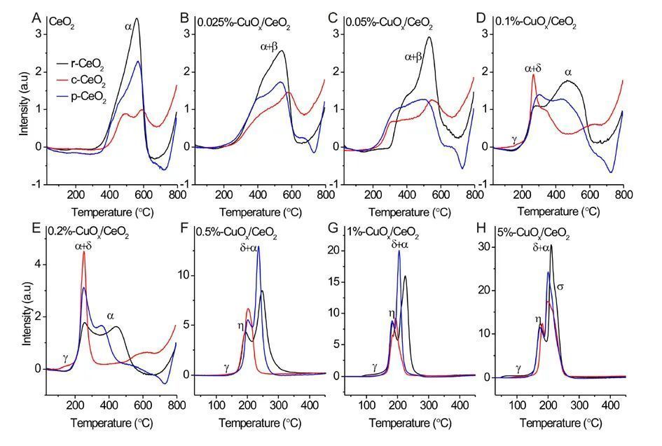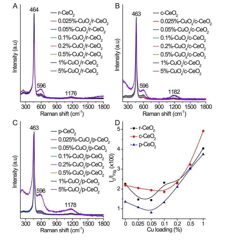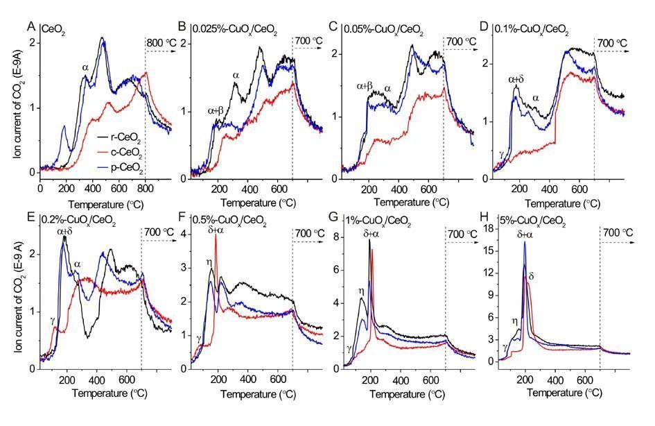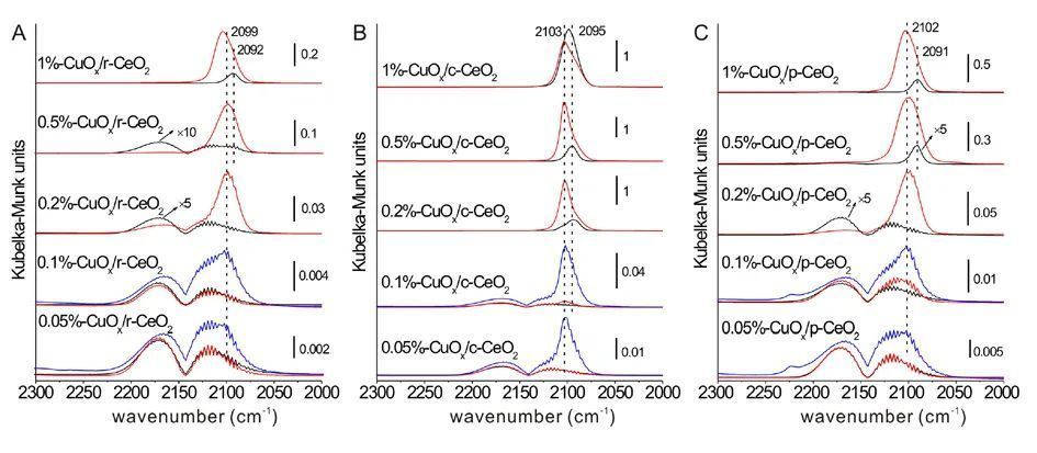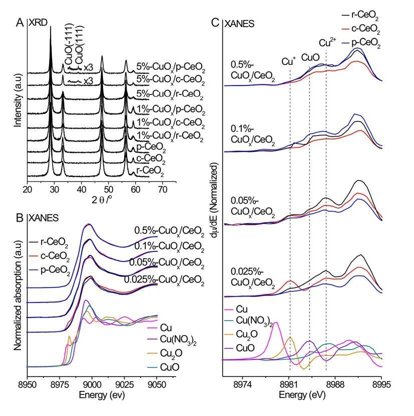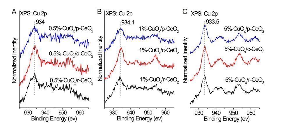 近日,《催化學(xué)報》在線發(fā)表了中國科學(xué)技術(shù)大學(xué)黃偉新教授團隊在CuOx-CeO2相互作用的最新研究成果。該工作報道了Cu擔(dān)載量為0.025%~5%的不同形貌CeO2納米晶負(fù)載的CuOx/CeO2催化劑中CuOx-CeO2相互作用及CO氧化反應(yīng)性能。論文共同第一作者為:高玉仙和張振華,論文通訊作者為:黃偉新。Cu在多相催化反應(yīng)中具有廣泛的應(yīng)用,如CO氧化反應(yīng)、富H2下的CO優(yōu)先氧化反應(yīng)、水氣變換反應(yīng)、甲醇合成反應(yīng)以及蒸汽重整反應(yīng)等。由于CeO2自身具有很好的儲氧能力、快速的氧化還原循環(huán)性能和能固定Cu物種以防其燒結(jié)的能力,因此經(jīng)常被用來作為Cu基催化劑的載體來使用。所得到的CuOx/CeO2(CuOx: Cu、Cu離子、Cu2O和CuO)催化劑在CO氧化反應(yīng)中展示了極好的催化能力。例如Avgouropoulos等人報道了CuO/CeO2催化劑在富氫條件下的CO氧化反應(yīng)中具有與貴金屬Pt/Al2O3和Au/Fe2O3催化劑相當(dāng)?shù)拇呋钚浴N墨I(xiàn)研究結(jié)果表明 CuOx/CeO2催化劑在CO氧化反應(yīng)中具有結(jié)構(gòu)敏感性。Liu等人最早提出了CuOx/CeO2催化劑在催化CO氧化反應(yīng)中其反應(yīng)物CO傾向于吸附在CuOx-CeO2界面的Cu(I)位點上。之后,催化劑組成、制備方法和CeO2前驅(qū)體等因素都被詳細(xì)地研究,用來理解CuOx/CeO2催化劑在CO氧化反應(yīng)中的構(gòu)-效關(guān)系。氧化物形貌控制是無需改變催化劑組成,但能夠有效調(diào)節(jié)催化劑結(jié)構(gòu)和性能的有效策略。CeO2納米晶具有豐富、可控的形貌,包括立方體、八面體、納米棒、納米線、納米管和納米多面體等。文獻(xiàn)研究結(jié)果建立了形貌依賴的CeO2催化作用,包括CuOx/CeO2催化作用。王等人報道了亞納米CuOx團簇負(fù)載在CeO2{110}晶面的催化CO氧化活性低于負(fù)載在CeO2{111}晶面,其主要原因是在CeO2{111}晶面上能夠形成一種強束縛Cu-[Ox]-Ce結(jié)構(gòu)。而Lykaki等人以不同形貌CeO2納米晶負(fù)載Cu擔(dān)載量約為7.5%的CuO,發(fā)現(xiàn)CuO/CeO2納米棒表現(xiàn)最好的催化活性,并歸因于弱束縛氧物種的含量、Cu+/Ce3+氧化還原對的相對數(shù)量、缺陷和氧空位的相對含量。雖然已經(jīng)有較多的文獻(xiàn)結(jié)果,但對CuOx-CeO2相互作用的全面認(rèn)識仍然缺乏。本文采用等體積浸漬法制備了不同Cu擔(dān)載量(0.025%~5%)的CuOx負(fù)載在不同形貌CeO2納米晶(立方體、納米棒和納米多面體)的CuOx/CeO2催化劑,建立了隨Cu擔(dān)載量和CeO2形貌而變化的CuOx物種結(jié)構(gòu),并與其催化CO氧化活性相關(guān)聯(lián)。本文結(jié)果系統(tǒng)地闡明了CuOx/CeO2催化劑的CuOx-CeO2相互作用及在CO氧化反應(yīng)中的構(gòu)-效關(guān)系。本文以不同形貌CeO2納米晶為載體,包括優(yōu)先暴露{110}+{100}晶面的CeO2納米棒、優(yōu)先暴露{100}晶面的CeO2納米立方體和優(yōu)先暴露{111}晶面的CeO2納米多面體, 采用等體積浸漬方法合成了Cu擔(dān)載量為0.025%~5%的CuOx/CeO2納米晶催化劑, 結(jié)合譜學(xué)和電鏡表征方法, 以及CO吸附原位紅外光譜, 系統(tǒng)研究了CuOx物種在不同形貌CeO2納米晶上的結(jié)構(gòu)演化及其催化CO氧化的構(gòu)-效關(guān)系。 基于單原子催化劑(SACs),考慮到單個原子和支撐材料之間的接觸面積小且相互作用相對較弱,為了進一步增加單原子活性位點數(shù)量和負(fù)載量,雙原子催化劑(DACs)作為單原子催化劑擴展的家庭成員近年來開始新興。盡管雙原子催化劑方面的研究還處在萌芽階段,但截止目前已報道的研究工作主要集中在兩個方面:同核金屬雙原子催化劑和異核金屬雙原子催化劑,而其中大多研究與同核金屬雙原子相關(guān)。本文基于當(dāng)前最新的研究工作對比了同核/異核DACs的不同優(yōu)勢。對于制備得到性能優(yōu)異的DACs,一系列包括原子層沉積法、濕化學(xué)吸附法以及高溫?zé)崽幚矸ǖ仍趦?nèi)的方法被列舉,其中高溫?zé)崽幚矸ㄒ驊?yīng)用廣泛被重點強調(diào)。與此同時,本文也對DACs的表征和識別手段進行了重點概括,包含XANES,EXAFS,IR,DFT等。此外,對于當(dāng)前DACs在電化學(xué)方面的主要應(yīng)用方向也在文中進行了詳細(xì)歸納和對比。主要應(yīng)用以氧還原反應(yīng)(ORR)和二氧化碳還原反應(yīng)(CO2RR)為主。圖1. (A1-C1)r-CeO2、c-CeO2和p-CeO2納米晶的TEM圖;5%-CuOx/r-CeO2、5%-CuOx/c-CeO2和5%-CuOx/p-CeO2催化劑的(A2-C2)TEM和(A3-C3)HRTEM圖。要點: 圖1電鏡結(jié)果表明不同形貌CeO2納米晶的形貌較均一,并在CuOx/CeO2催化劑中維持其初始相貌。同時,HRTEM也未能夠在5%-CuOx/CeO2催化劑中觀察到CuOx的晶格條紋。圖2. 不同CeO2和CuOx/CeO2催化劑的(A)XRD譜圖、(B)Cu K-edge XANES譜圖和(C)對應(yīng)的微分譜圖。要點:在XRD譜圖中(圖2A),CuO的衍射峰信號僅僅在5%-CuOx/c-CeO2和5%-CuOx/p-CeO2催化劑上被觀測到,表明其它催化劑中CuOx物種具有高的分散度。不同CuOx/CeO2催化劑展示了相似的Cu K-edge XANES譜圖(圖2B),但其對應(yīng)的微分譜圖(圖2C)表現(xiàn)出顯著區(qū)別,表明隨Cu擔(dān)載量的增加,CuOx/c-CeO2催化劑中CuOx物種的結(jié)構(gòu)演化是從孤立的Cu+到孤立的Cu2+、然后到CuO,CuOx/r-CeO2和CuOx/p-CeO2催化劑中CuOx物種的結(jié)構(gòu)演化是從孤立的Cu2+到CuO。圖3. (A)0.5%-CuOx/CeO2、(A)1%-CuOx/CeO2和(A)5%-CuOx/CeO2催化劑的Cu 2p XPS譜圖。要點:在Cu 2p XPS譜圖中,結(jié)合能位于934 eV和933.5 eV的譜峰