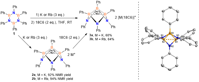 芳香性是有機化學的基本概念之一,且隨著有機和理論化學家認識的深入而不斷被擴充,例如反芳香性、莫比烏斯芳香性、同芳香性等概念的發展。其中,同芳香性用于描述在芳香環內嵌入一個或多個sp3雜化的碳原子后仍在空間上保持共軛,具有芳香性特征的環系。隨著研究的推進,不僅碳環體系,在雜原子環系,尤其是硼環體系中也存在著同芳香性這一現象。北京大學席振峰-張文雄課題組此前曾致力于芳香性金屬有機化學的研究,近日,北京大學席振峰-張文雄課題組報道了通過六苯基無機苯(B3N3Ph6)的雙電子還原實現了三中心硼同芳香性陰離子的化學合成,并對此進行了電子結構理論和化學性質上的探討,相關成果在線發表于Angew. Chem. Int. Ed.(DOI: 10.1002/anie.201916651)。