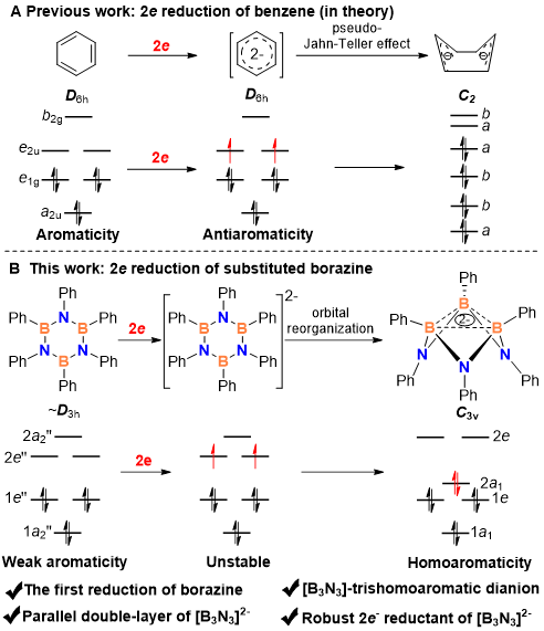苯作為一種常見的芳香化合物,可經歷Birch還原破壞其芳香性生成1,4-環己二烯,反應中苯同時接受了質子和電子。理論上,苯可直接經歷雙電子還原轉變為不穩定的、具有8π電子的反芳香性中間體,然后基于次級Jahn-Teller效應打破苯環D6h對稱性形成雙自由基負離子,這一點已被堿金屬還原苯衍生物的實驗所證實。無機苯類化合物(B3N3R6)是苯的π-等電子體。由于硼氮之間的電負性差異,無機苯電子離域作用相當有限,僅具有弱芳香性,此外,無機苯最高對稱點群為D3h。這些因素使得無機苯具有不同于苯的特殊性質。本文報道了六苯基取代無機苯(B3N3R6),在強還原劑作用下經歷不同于苯的雙電子還原過程,生成閉殼層同芳香性的[B3N3R6]2-陰離子(圖1)。