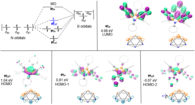 電子結構理論分析如圖3。通過將[B3N3Ph6]2-p-分子軌道可視化,可知B3N3Ph6還原后在發生幾何重構的同時進行了軌道變換,由于硼氮幾何位置的上下交錯導致它們p軌道之間呈現反常的共軛效應,反鍵軌道y2a1具有明顯的成鍵特征,導致能量下降,取代了硼氮苯中的y2e成為[B3N3Ph6]2-的HOMO軌道。這一點可以從硼氮p軌道選定相位的夾角中看出,例如在y1a1中反相位夾角為61o。