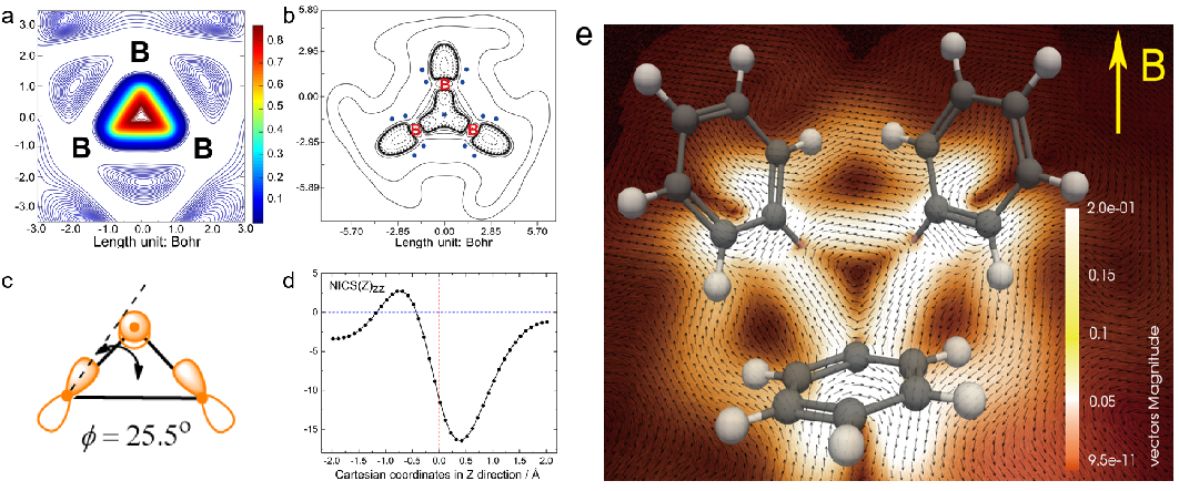 4 a)三個硼原子(B3)平面上Z = 1.0 Bohr處LOL等高線填色圖;b)B3平面上Z = 1.0 Bohr處電子密度拉普拉斯函數的拓撲分析;c)硼原子之間p軌道的夾角為25.5o;(d) B3平面的NICSZZ值隨垂直方向距離的變化;e)B3平面上方的Z = 1 Bohr處感應電流截面圖。
