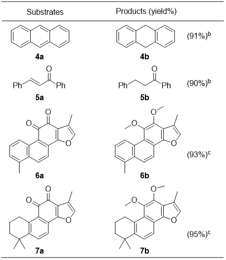 化學性質方面,[B3N3R6]2-陰離子可作為一些不飽和化合物(如蒽,查爾酮和丹參酮)的高效雙電子還原劑,具有高效、高選擇性、反應條件溫和且無機苯在反應結束后可以回收等優點(圖5)。