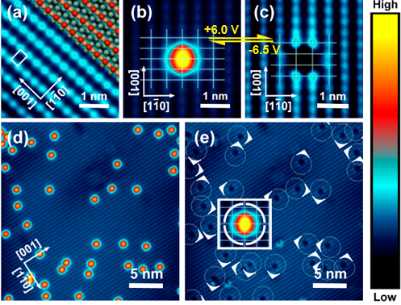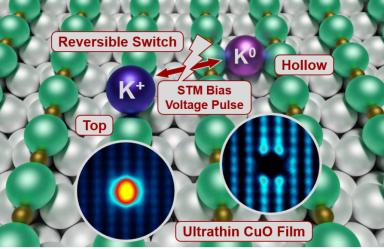 對鉀離子及其周圍的局域功函數成像顯示,在鉀離子的周圍形成了半徑約為1 nm的局域負電荷中心,這說明鉀在氧化物表面的電子效應很可能被局域在鉀離子附近區域。推測鉀離子吸附位置正下方的二價銅離子被部分還原,附近結構發生馳豫,與鉀離子和氧離子構成了新的復合離子結構。以上實驗證明,超薄氧化銅上的鉀離子與襯底之間具有強烈的離子間相互作用,或者說,鉀離子已經摻雜進了超薄氧化銅的晶格中。▲超薄氧化銅襯底(a)及其表面負載的K正離子(b,d)和STM偏壓脈沖操縱后的中性鉀原子(c,e)的STM圖像