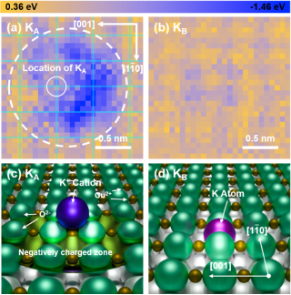 通過STM針尖施加的偏壓脈沖,鉀離子還可以與另一表面物種實現可逆互變。局域功函數成像證明這一新的物種是中性的鉀原子。實驗還發現,這兩種電荷態的鉀物種在超薄氧化銅上具有不同的吸附位點——原本位于銅離子頂位的鉀離子在轉變為中性鉀原子后遷移到由四個銅離子構成的矩形hollow位置。 ▲超薄氧化銅上鉀正離子(a)與中性鉀原子(a)的局域功函數成像,其數值等于它們引起的相對襯底的功函數變化,以及它們的原子模型(c,d)