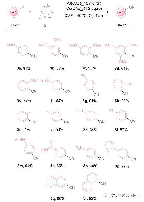 盡管該領域已經發展的比較成熟,然而發展更加安全的方法合成芳香腈類化合物顯得仍然很有必要,正是在這樣一個背景下,最近來自常州大學的Cheng團隊報道了烏洛托品作為CN源的碘代芳烴的偶聯反應,反應底物普適性很廣,產率最高可達91%(圖2)。
