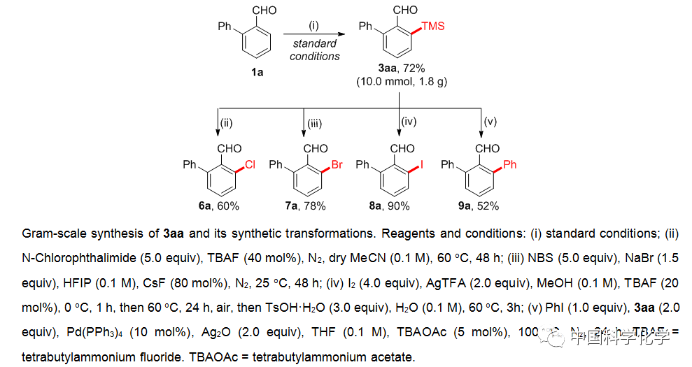 隨后,他們通過克級合成和硅基的多樣性轉(zhuǎn)化(氯代、溴代、碘代和偶聯(lián))進(jìn)一步證明了該反應(yīng)的實(shí)用性和潛力(圖5)。