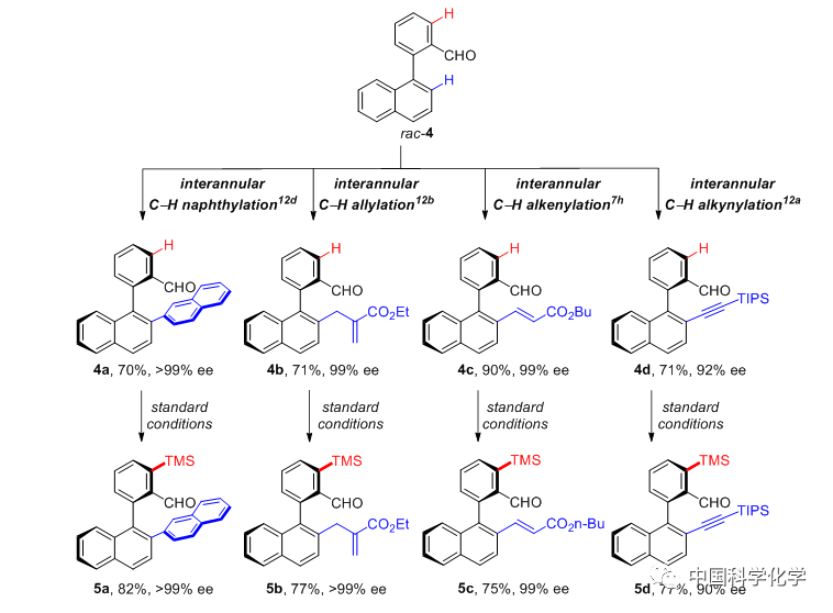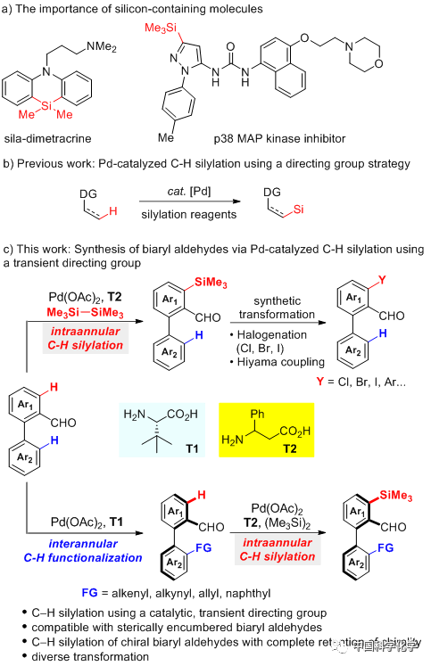 鑒于軸手性聯(lián)芳醛骨架廣泛存在于天然產(chǎn)物中,而且在眾多不對稱反應(yīng)中常被用作優(yōu)勢配體或催化劑,史炳鋒教授課題組對軸手性聯(lián)芳醛化合物的合成產(chǎn)生了濃厚的興趣。近年來,該課題組通過鈀催化的阻旋C-H鍵官能團(tuán)化實(shí)現(xiàn)了多樣性合成軸手性聯(lián)芳醛化合物,如烯基化、炔基化、烯丙基化和萘基化。在此基礎(chǔ)之上,考慮到聯(lián)芳醛骨架和硅基的重要性及實(shí)用性,史炳鋒團(tuán)隊設(shè)想如果能夠發(fā)展一個同環(huán)上的C-H鍵的硅基化反應(yīng),隨后硅基的轉(zhuǎn)化將會為聯(lián)芳醛的多樣性合成提供巨大的機(jī)會(圖1c,上圖)。此外,將他們之前發(fā)展的跨環(huán)的C-H鍵的官能團(tuán)化和新發(fā)展的同環(huán)的C-H鍵的硅基化結(jié)合起來制備軸手性聯(lián)芳醛化合物將更有吸引力(圖1c,下圖)。