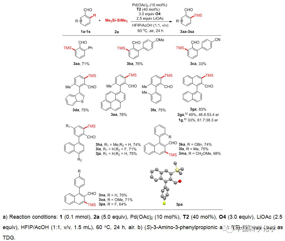 在最優(yōu)反應(yīng)條件下,他們考察了硅基化底物的適用范圍(圖3)。研究發(fā)現(xiàn),該反應(yīng)體系適用于各種含供、吸電子基團(tuán)的聯(lián)芳醛,但含吸電子基團(tuán)的聯(lián)芳醛的反應(yīng)活性低于含供電子基團(tuán)的;雜環(huán)芳烴(如含苯并噻吩)的底物在該反應(yīng)體系中也能順利進(jìn)行硅基化;對大位阻的底物也有很好的容忍性;但其他的雙硅烷試劑不適用于該反應(yīng)體系。
