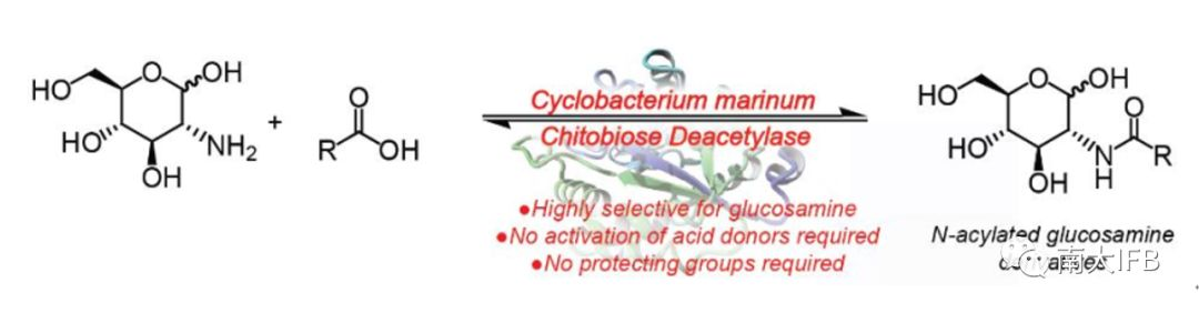 目前殼多糖主要是通過化學-酶法進行代謝 (Scheme 1)。首先殼多糖解聚得到乙酰葡萄糖胺(1),隨后酶解得到葡萄糖胺(2)。葡萄糖胺再經過N-酰基化、異構化、聚合等反應生成糖類生物工程產品。但是由于缺乏特異性的N-酰基化酶,從2轉變成3這一步只能依賴于化學手段,且反應條件苛刻,需要活化的有機酸、化學計量偶聯劑和保護基團。對于自然界是否存在催化葡萄糖胺N-酰基反應的生物催化劑,仍有待確證。