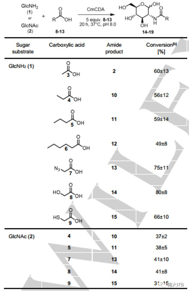 于是研究人員將5當量的乙酸(3)、丙酸(4)、丁酸(5)、己酸(6)、疊碳乙酸(7)、羥基乙酸(8)、巰基乙酸(9)分別與CmCDA、葡萄糖胺(1)進行孵育(Table 1),果然能生成相應的N-酰基化合物2和10-15。同樣的反應條件,CmCDA卻不能接受苯甲酸作為羧酸供體,可能是酶對大基團芳香有機酸的空間和電子限制有關。反應需要過量羧酸是由于加入等當量的有機酸時,產率較低,而加入5當量則使反應平衡轉向酰胺鍵形成。