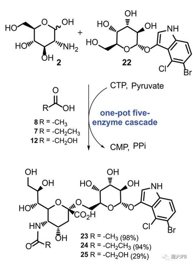 為了拓展該酶的用途,研究人員設計了“一鍋酶法”合成唾液酸苷衍生物的路線(Scheme 4)。首先葡萄糖胺(1)在CmCDA作用下與羧酸供體7, 8, 12反應生成相應的N-酰基葡萄糖胺,在異構酶作用下轉變成N-酰基甘露糖胺,然后酶催化與丙酮酸進行aldol加成生成“非天然”的唾液酸衍生物。最后與5-溴-4-氯-吲哚-β-D-半乳糖-吡喃糖苷(X-Gal,22)進行孵育,生成相應的唾液酸低聚糖苷23-25。這一過程只需五步酶催化就可以實現。