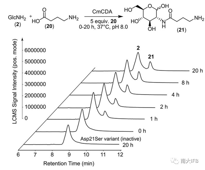 Scheme 3. LCMS analysis of CmCDA-catalysed N-acylation reaction of 1 and protection free 20shows the formation of 21
