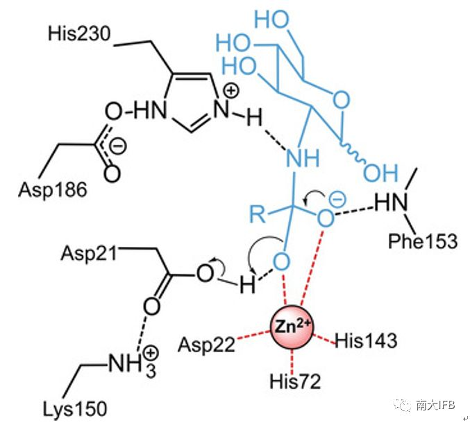 在沒有催化葡萄糖胺N-酰基化候選酶的情況下,研究人員從尋求已知生物催化劑的雜泛活性入手。該課題組曾報道一個殼多糖去乙酰化酶CmCDA,它能特異催化N-酰基葡萄糖胺發生去酰基化。研究人員推測保守氨基酸殘基His-His-Asp鋅結合三聯體穩定N-乙酰基,組氨酸和天冬氨酸分別作為廣義酸和堿催化形成四面體含氧陰離子,從而發生去乙酰化(Scheme 2)。依據此機制,研究人員假設CmCDA應該能夠催化去乙酰化的逆反應-N-酰基化。