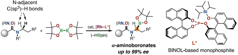 近期,日本北海道大學的Masaya Sawamura教授報道了一種銠手性磷酸酯配體的催化體系,該體系能夠對2-(N-烷基氨基)雜芳基和烷酰基或芳酰基酰胺等化合物進行硼烷化反應。