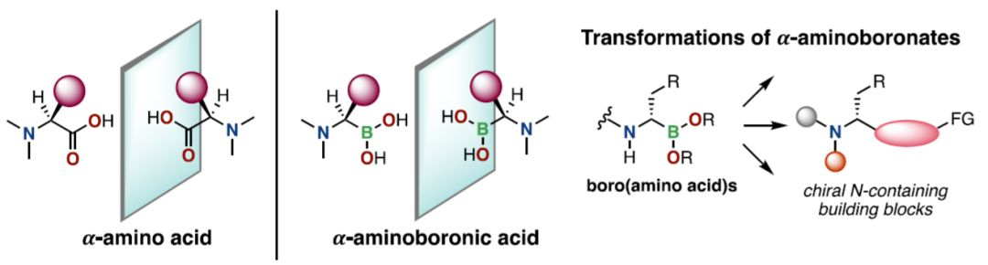 近年來,由于對具有藥物活性的含硼化合物的需求不斷增長,所以如何有效開發合成手性的α-氨基硼酸也成了一種必要的研究。因為烷基硼酸酯參與了許多轉化,這些通過各種碳硼鍵的轉化產生一系列的內源多功能性產物,使得人們對于高效合成這些化合物的需求也是很高的。