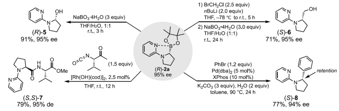 該研究也對這種手性α-氨基硼酸酯應用在立體選擇性的轉化中,包括與芳基鹵化物Suzuki-Miyaura偶聯和與α-氨基酸的異氰酸酯衍生物進行銠催化的反應來提供了一種新的肽鏈延伸方法等。
