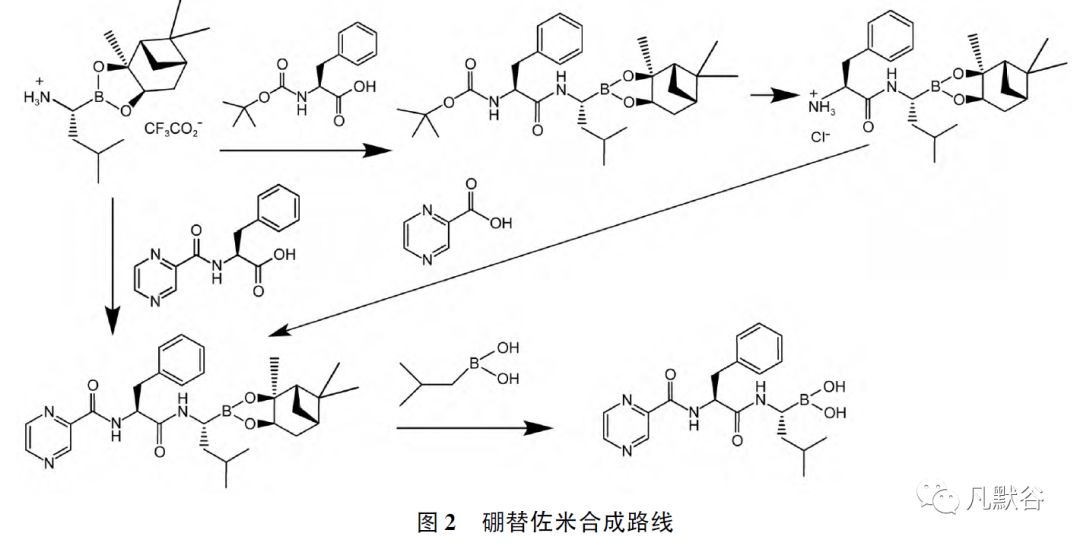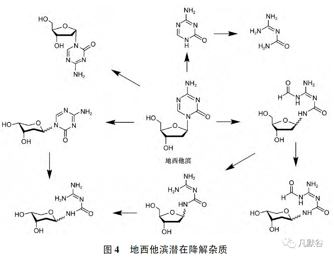 化學藥物中的有機雜質又稱有關物質。 該類雜質通常與活性成分具有類似的化學結構,其來源和去向的分析,以及準確和有效的控制,是化學仿制藥藥學研究的關鍵項目之一。 本文以硼替佐米、地西他濱和吉西他濱為例,結合原料藥的合成方法、制劑的處方工藝和降解研究,分析原料藥及其制劑中可能存在的有機雜質,包括起始原料、中間體、工藝副產物、降解產物等,并基于“質量源于設計”的理念,提出相應的雜質控制策略,實現“全程控制”,有效確保藥物的安全有效和質量可控。 關鍵詞 有機雜質; 過程控制; 質量源于設計; 硼替佐米; 地西他濱; 吉西他濱 正文 化學藥物的雜質是指存在于化學藥物中的無治療作用或影響藥物穩定性、療效,甚至對人體健康有害的物質。 任何影響藥物純度的物質均可稱為雜質。 雜質的分析和控制是保障用藥安全有效的基礎。 因此,雜質研究在仿制藥藥學研究中占有重要地位,其是否得到全面準確的分析和控制,直接關系到藥品的質量可控與安全性。 化學藥物中的雜質根據其理化性質一般可分為有機雜質、無機雜質和殘留溶劑[1]。 其中,有機雜質又稱有關物質。 這類雜質通常與活性成分具有類似的化學結構,可能具有一定的生理活性,其來源和去向的分析,以及準確和有效的控制,是化學仿制藥質量研究的關鍵。 本文結合質量源于設計( quality by design,QbD)以及目前仿制藥雜質研究與控制的一些基本理念[2 - 4],以硼替佐米( bortezomib) 、地西他濱( decitabine)和吉西他濱( gemcitabine) 為例,結合化合物結構特點、原料藥合成路線、制劑處方工藝、降解途徑和相關文獻資料,對其有機雜質進行分析,并探討相應的雜質控制策略,以期為仿制藥的雜質研究工作提供參考思路。 需要指出的是,本文不對遺傳毒性雜質等高毒性物質進行討論,可參照相關指導原則研究。 1 工藝雜質的分析和控制 原料藥的工藝雜質可能來源于起始原料、起始原料引入的雜質及其后續反應物、中間體、副反應產物及其后續反應物、反應中使用的有機試劑等?,F以硼替佐米為例,結合其制備工藝,探討原料藥工藝雜質的分析及其控制策略。 硼替佐米,化學名稱為[( 1R) -3-甲基-1-[[( 2S) -1-氧-3-苯基-2-[( 吡嗪羧基) 氨基]丙基]氨基]丁基]硼酸,由千禧( Millennium) 制藥( 后被日本武田制藥公司收購) 和強生共同開發,是全球上市的第一個合成的蛋白酶體抑制劑,為靶向治療的新型抗癌藥。 硼替佐米原料藥在固體狀態下以三聚體形式( 無水三聚環硼氧烷酸酐結構) 存在,在水溶液中解離為單體,并與三聚體平衡存在[5]( 見圖1) 其制劑注射用硼替佐米于2003 年在美國上市,2004 年在歐洲上市,2005 年獲準進口中國,商品名“Velcade /萬珂”,用于治療多發性骨髓瘤和套細胞淋巴瘤。 2015 年10 月硼替佐米化合物專利到期,注射用硼替佐米隨即成為國內化學藥物仿制藥申報的熱點品種之一。 國內外均有報道硼替佐米的合成和制備工藝[6 - 7],通過總結分析,實際制備采用的合成路線比較一致,即在原研化合物專利路線的基礎上[8],以L-硼亮氨酸蒎烷二醇酯為起始原料,首先與氨基保護的L-苯丙氨酸縮合,再脫保護后與2-甲酸吡嗪縮合,形成硼替佐米蒎烷二醇酯,然后在異丁基硼酸條件下脫蒎烷保護基獲得硼替佐米粗品,精制,即得硼替佐米原料藥。 或以L-硼亮氨酸蒎烷二醇酯為起始原料,直接與N-吡嗪羰基-L-苯丙氨酸縮合形成硼替佐米蒎烷二醇酯,再脫保護獲得硼替佐米粗品,精制,得到硼替佐米,見圖2。 1.1 起始原料及其引入雜質 結合工藝路線,硼替佐米主要起始原料包括L-硼亮氨酸蒎烷二醇酯、N-吡嗪羰基-L-苯丙氨酸或氨基保護的苯丙氨酸和2-甲酸吡嗪。 L-硼亮氨酸蒎烷二醇酯一般由異丁基硼酸和蒎烷二醇反應生成異丁基硼酸蒎烷二醇酯后,經鹵代、氨基取代獲得,通常使用其三氟乙酸鹽。 結合制備工藝,其主要有機雜質包括: 起始物料蒎烷二醇和異丁基硼酸,中間體異丙基硼酸蒎烷二醇酯、鹵代物,異構體雜質D-硼亮氨酸蒎烷二醇酯,以及可能降解產生的異戊胺等。 該起始原料的手性中心將直接帶入成品,其異構體雜質可能繼續反應生成成品對映異構體R,S-硼替佐米和非對映異構體S,S-硼替佐米,因此異構體雜質應作為關鍵質控項。 N-吡嗪羰基-L-苯丙氨酸通常由L-苯丙氨酸成酯( 如,甲酯、三甲基硅酯) 后與2-甲酸吡嗪反應獲得。 結合制備工藝,分析其主要有機雜質包括: 起始物料L-苯丙氨酸和2-甲酸吡嗪,中間體L-苯丙氨酸酯,副產物苯丙氨酸二聚體,以及異構體雜質N-吡嗪羰基-D-苯丙氨酸等。 該物料的手性中心也直接帶入成品,異構體雜質應作為關鍵雜質控制。 工藝中常用的氨基保護的苯丙氨酸為N-叔丁氧羰基-L-苯丙氨酸,由L-苯丙氨酸與Boc 酸酐?;磻@得,其異構體也應作為關鍵雜質控制。 2-甲酸吡嗪工藝較為成熟,可由2-氰基吡嗪氧化或吡嗪二羧酸脫羧制得,其可能存在的雜質包括起始物料和吡嗪羧酸酯。 硼替佐米結構較為復雜,起始原料本身也是成品重要的工藝雜質。同時,蒎烷結構在制藥行業使用相對較少,且成品手性中心均由起始物料引入。 因此,基于源頭控制的理念,原料藥生產企業如采用外購起始原料,應嚴格進行供應商篩選和審計,充分理解供應商的制備工藝,并結合自身工藝特點,分析起始原料的關鍵質量屬性,特別是起始原料及其雜質在后續工藝過程中的轉化和去除情況,針對性地建立起始