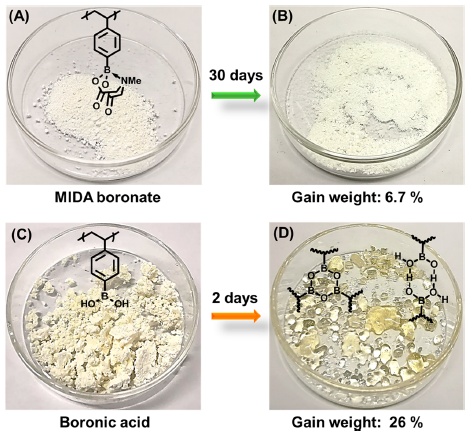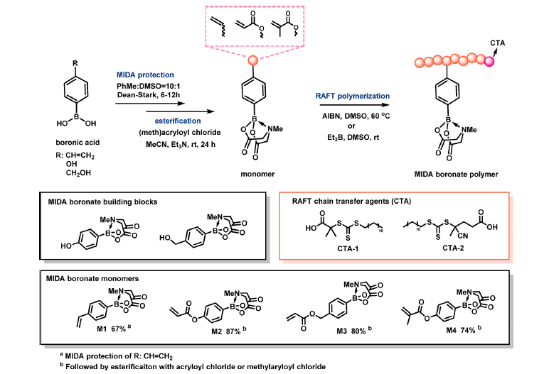 由于具備良好的化學反應活性,pH、糖響應性,硼酸及硼酸酯類被廣泛應用于高分子合成及材料研究領域。Liebler等人利用硼酸酯的酯交換特性設計了可重復加工的熱固性塑料(Science 2017, 356, 62-65);而利用硼酸聚合物環境影響性制備功能材料的的研究更是繁多(舉例:Nat. Nanotechnol. 2013, 8,959-68)。然而,含硼酸聚合物的合成一直以來是個挑戰。硼酸單體的不穩定、種類單一;硼酸均聚物無法用GPC表征、易吸潮等弊端很大程度上限制了含硼酸聚合物的進一步應用。