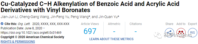 總結:余金權課題組報道了在噁唑啉-苯胺導向基團的協助下,Cu(Ⅱ)催化的苯甲酸和烯丙酸衍生物與乙烯基硼酸酯的烯基化反應構建各種多取代烯烴和二烯化合物,該反應具有條件溫和,官能團范圍廣,雜環對該反應也具有容忍性等特點。