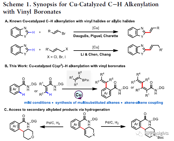 多取代烯烴和二烯骨架在天然產物和有機材料中廣泛存在,是許多氧化和還原反應中常用的合成子。C-H與乙烯基硼的偶聯是合成此類化合物具有吸引力的途徑。最近,Daugulis,Piguel,Charette等人報道了了在強堿條件下,酸性C-H和乙烯基鹵化物的直接烯基化反應,Li,Chen和Chang等使用烯丙基鹵化物實現了酸性更強的芳基C-H鍵的烯基化(Scheme 1a)。近日,美國Scripps研究所余金權課題組在 Organic letters 報道了在噁唑啉-苯胺導向基團的協助下,Cu(Ⅱ)催化的苯甲酸和烯丙酸衍生物與乙烯基硼酸酯的烯基化反應構建各種多取代烯烴和二烯化合物。(DOI:10.1021/acs.orglett.0c01469)