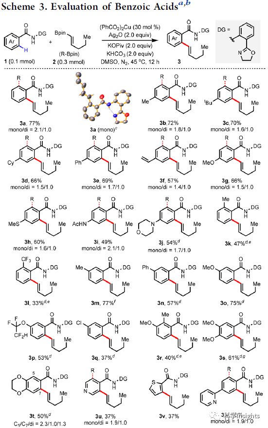 在最優的反應條件下,作者以(E)-1-戊烯基硼酸頻哪醇酯(2)為烯基化試劑評價了苯甲酸的底物范圍(Scheme 3)。相對于間位和鄰位取代的苯甲酸,鄰位取代的苯甲酸產率較低(3k,3l)。對位取代的底物以較高的產率得到單,雙產物混合物(3b-3j,3w),由于空間位阻,間位取代的底物僅發生單烯基化(3m-3r)。雜環底物也能參與該烯基化反應,但是收率較低(3u-3w)。