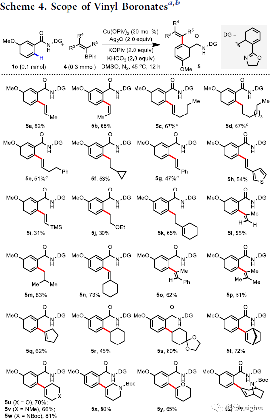 首先,作者使用易于脫去的噁唑啉-苯胺為導向基團進行條件篩選,發現底物1a和(E)-1-戊烯基硼酸頻哪醇酯(2)在此前芳基化的條件下交叉偶聯得到單烯基化產物(產率:7%)和羥基化副產物(產率:11%)。作者進一步系統的篩選了Cu催化劑,溶劑,溫度(Scheme 2),發現在N2保護下,溫度45℃,苯甲酸銅(II)(30 mol%),Ag2O(2.0 equiv),KOPiv(2.0 equiv),KHCO3(2.0 equiv),DMSO(2.0 mL)為最優反應條件。對照實驗表明:若缺少苯甲酸銅(II)和堿,反應不能發生;若缺少Ag2O,則僅得到痕量的產物;KOPiv,KHCO3對反應的產率至關重要。