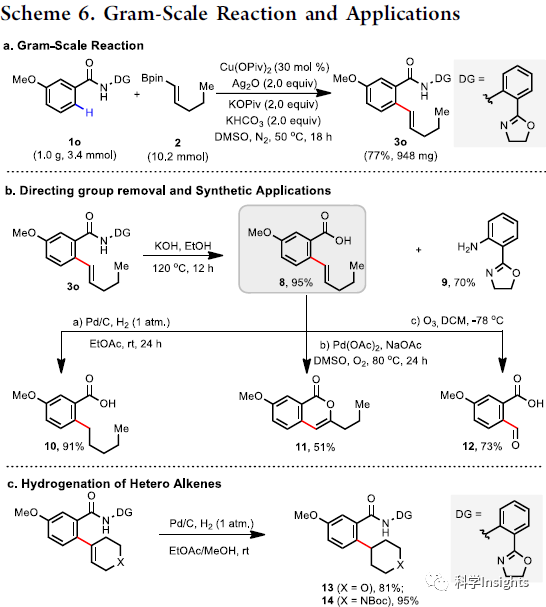 作者通過1o(1g)和(E)-1-戊烯基硼酸頻哪醇酯(2)的反應證明了該反應的可擴展性(Scheme 6a),且導向基團在堿性的條件下能夠輕易的脫去。反應生成的烯基苯甲酸是重要的有機合成中間體,能夠轉化為烷基苯甲酸(10),內酯(11),和醛(12)(Scheme 6b)。雜環烯烴衍生物的氫化反應分別以81%和95%的收率得到烷基化四氫吡喃(13)和哌啶(14)(Scheme 6c)。