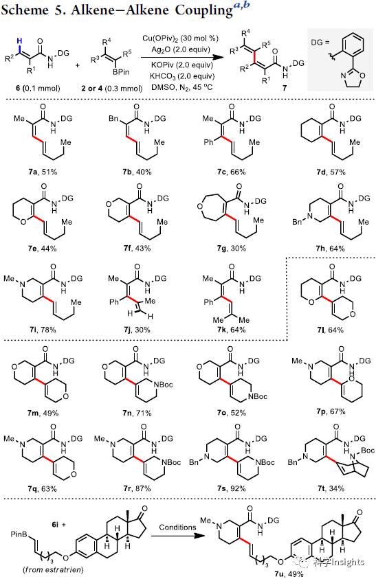 考慮到二烯烴在合成中的重要性,并且在活性分子中廣泛存在,作者探究了乙烯基C-H鍵與乙烯基硼酸酯的直接偶聯(Scheme 5)。各種烯烴在該溫和的反應條件下以30%-78%的產率得到相應的二烯化合物(7a?7k)。雜環底物對該反應也具有兼容性,能夠以較高產率得到烯基化的雜環(7e?7i),也可以直接與雜環烯基硼酸酯高效的偶聯(7l?7t)。6i與雌激素衍生的乙烯基硼酸酯的直接偶聯證明了在復雜生物活性分子后期官能化中的通用性。