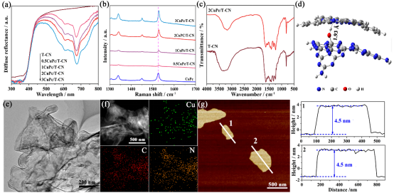以尿素為前驅(qū)體,通過熱聚合法合成CN,隨后經(jīng)HNO3溶液處理后得到了表面羥基量增加的超薄CN納米片(T-CN)。通過表面羥基誘導組裝,將MPc均勻分散在T-CN表面,最終形成超薄MPc/T-CN異質(zhì)結(jié)。所構(gòu)筑的不同MPc/T-CN異質(zhì)結(jié)均可以提升T-CN光生電荷分離性能和光催化活性,其中CuPc/T-CN異質(zhì)結(jié)具有最佳的光催化性能。利用理論計算和實驗揭示了不同MPc對CO2活化能力的影響,證明了CuPc具有最佳的CO2活化能力。▲Fig. 2. (a) DRS spectra of T-CN and xCuPc/T-CN. (b) Raman spectra of CuPc and xCuPc/T-CN at 1300-1700 cm-1. (c) FT-IR spectra of T-CN and 2CuPc/T-CN. (d) The optimized CuPc/CN structure by DFT calculations, the length of hydrogen bond between N on CuPc and hydroxyl on CN is 1.93 ?. (e) TEM image of 2CuPc/T-CN and (f) HAADF-STEM image of 2CuPc/T-CN with the corresponding EDS mapping images of elemental Cu, C and N. (g) The AFM image and the corresponding height profiles of 2CuPc/T-CN.