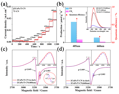 通過探究CuPc負載量對異質(zhì)結(jié)光催化性能的影響,獲得了CuPc與T-CN的質(zhì)量百分比為2%時的光催化活性最佳。拉曼光譜(圖2b)位于1528 cm-1處的CuPc中C-N-C鍵的拉伸振動峰發(fā)生明顯的拉曼位移,表明T-CN與CuPc的配體之間存在化學作用。同時,歸一化的FT-IR圖(圖2c)表明異質(zhì)結(jié)中T-CN表面羥基的量減少,意味著CuPc與T-CN的表面羥基間存在的化學作用。通過實驗結(jié)果推測T-CN上的羥基與CuPc配體中的橋連N形成氫鍵,獲得緊密連接的界面。進一步通過理論計算(圖2d),確認T-CN與CuPc的氫鍵連接方式,同時證明了這種連接方式更加有利于CuPc在T-CN上的均勻分散(圖e-f),異質(zhì)結(jié)的厚度約為4.5 nm(T-CN的厚度約為3.5 nm)(圖2g)。▲Fig. 3. (a) Normalized photocurrent action spectra of T-CN and 2CuPc/T-CN under different monochromatic light irradiation. (b) Photocatalytic activities and the quantum efficiency for CO2 conversion under 405 and 660 nm monochromatic light irradiation of 2CuPc/T-CN. The insert shows the FS related to the formed ?OH of T-CN and 2CuPc/T-CN under different monochromatic light irradiation. (c) EPR spectra of 2CuPc/T-CN with 405 nm and (d) 660 nm monochromatic light irradiation and in dark under 98 K.