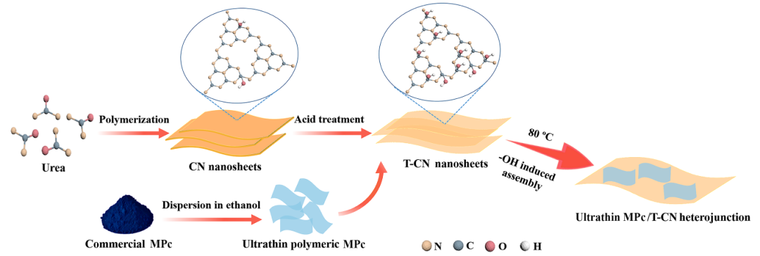 論文DOI:10.1016/j.apcatb.2020.119199A. 半導體光催化CO2轉(zhuǎn)化技術(shù)化石燃料的快速消耗和大氣中CO2含量的增加引發(fā)了能源短缺和環(huán)境污染的問題。將過量排放的CO2轉(zhuǎn)化為有價值的化學燃料,降低大氣中CO2濃度,是解決能源危機和全球變暖最具潛力的途徑之一。半導體光催化CO2轉(zhuǎn)化技術(shù),以太陽能為驅(qū)動力,利用半導體光催化劑激發(fā)所產(chǎn)生的光生電子將CO2還原為有價值的化學燃料(例如CO,CH4等),成為了當今研究的熱點之一。半導體光催化劑作為該技術(shù)的核心,其光催化活性是至關重要的。g-C3N4作為一種具有可見光響應、熱化學性質(zhì)穩(wěn)定、廉價易得的非金屬二維結(jié)構(gòu)光催化劑被廣泛研究。但由于其光生載流子易復合、可見光吸收范圍較窄,其光催化活性仍不理想。基于此,我們首先通過控制合成超薄g-C3N4納米片,使其光生電荷傳輸?shù)木嚯x最小化,提高其自身的光催化活性。在此基礎上,進一步通過構(gòu)建異質(zhì)結(jié)體系來改善其光催化活性。值得注意的是,與g-C3N4構(gòu)建異質(zhì)結(jié)體系常常忽略:因此,開發(fā)具有維度匹配和寬可見光響應,特別是具有催化功能的異質(zhì)結(jié)體系是非常必要的。酞菁金屬配合物(MPc)是一類具有與g-C3N4類似的二維結(jié)構(gòu)大環(huán)分子,常作為光敏化劑被報道。但從能級位置的角度考慮,其LUMO軌道的能級略高于g-C3N4的導帶底,MPc很可能成為接受g-C3N4高水平能級電子(HLEEs)的合適能級平臺。更重要的是,如果g-C3N4被激發(fā)的HLEEs轉(zhuǎn)移到MPc的配體,再由其配體轉(zhuǎn)移到中心金屬離子,則可發(fā)揮MPc中心金屬潛在的催化作用,為CO2轉(zhuǎn)化過程提供催化活性位。因此,如何制備維度匹配的MPc/g-C3N4超薄異質(zhì)結(jié)以實現(xiàn)高效的CO2轉(zhuǎn)化是關鍵。MPc由于自身的π-π作用,容易發(fā)生自聚集。同時,考慮到g-C3N4表面存在的一定數(shù)量羥基對g-C3N4與MPc間的π-π相互作用的影響。我們通過增加g-C3N4表面羥基的量,利用其表面羥基誘導MPc進行組裝,形成以氫鍵方式連接的緊密界面,促進異質(zhì)結(jié)間的電荷轉(zhuǎn)移。同時該組裝過程有利于MPc的分散,抑制其自聚合,進而實現(xiàn)超薄MPc/g-C3N4異質(zhì)結(jié)的構(gòu)建。通過HNO3溶液處理得到表面羥基量增加的超薄g-C3N4納米片(T-CN)。利用其表面羥基誘導組裝制備了維度匹配的超薄MPc/T-CN異質(zhì)結(jié),并通過實驗結(jié)果與理論計算確認了MPc與T-CN氫鍵連接的結(jié)合方式,證明了MPc/T-CN異質(zhì)結(jié)中的HLEE轉(zhuǎn)移機制,及MPc中心金屬對CO2活化能力。▲Fig. 1. Schematic illustration of the formation of MPc/T-CN heterojunction (M = Cu2+, Co2+ and Fe2+).