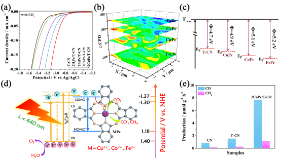 通過氣氛控制的穩(wěn)態(tài)/瞬態(tài)表面光電壓譜,單波長光電化學作用譜(圖3a)等證明CuPc/g-C3N4體系中兩種光生電荷轉(zhuǎn)移模式:一種是CuPc的敏化作用,也就是CuPc的電子向g-C3N4注入的過程;另一種是HLEE轉(zhuǎn)移機制,即T-CN被激發(fā)的HLEEs轉(zhuǎn)移到CuPc的配體,再轉(zhuǎn)移到其中心金屬單元Cu2+。通過單波長光催化CO2還原活性測試及其量子效率的計算(圖3b)證明其HLEE轉(zhuǎn)移機制是提高其光催化活性的關鍵,其貢獻遠大于CuPc的敏化作用。進一步通過EPR技術(shù)對兩種光生電荷轉(zhuǎn)移機制進行研究(圖c-d),通過記錄光照前后T-CN與CuPc/T-CN異質(zhì)結(jié)中g(shù)-C3N4的EPR信號強度增量,可量化的說明HLEE轉(zhuǎn)移機制的突出貢獻。同時,基于光照前后Cu2+的EPR信號的變化,可證明電子從配體轉(zhuǎn)移到中心Cu2+,并結(jié)合電化學還原曲線可對中心金屬的催化功能進一步揭示。▲Fig. 4. (a) Electrochemical reduction curves in CO2-bubbled system of T-CN, 2H2Pc/T-CN and 2MPc/T-CN. (b and c) SKP maps and schematic work function diagrams of T-CN and MPc. (d) Schematic of HLEEs transfer process in the fabricated MPc/CN heterojunction. (e) Photocatalytic activities for CO2 conversion under UV-vis light irradiation of CN, T-CN and 2CuPc/T-CN.
