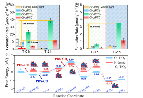 本工作通過水熱合成方法得到TiO2(AB)納米粒子,使用溶液等離子體技術(shù)(SPP)對TiO2(AB)納米粒子進(jìn)行處理,處理前后樣品的結(jié)構(gòu)、形貌以及晶相都沒有發(fā)生改變。對比SPP處理前后1H NMR譜,SPP處理后的1H NMR譜中有明顯的氫摻雜信號(H2、H3)產(chǎn)生。▲圖2. SPP處理0 h和2 h時的TiO2(AB)分別在(a)太陽光下和(b)可見光下的光催化及光熱催化產(chǎn)物速率;(c)Ov-TiO2和H摻雜Ov-TiO2從CO2至CH4的反應(yīng)自由能。