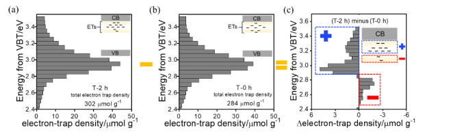 經(jīng)SPP處理的TiO2(AB)相對于未處理的TiO2(AB)捕獲電子數(shù)增加18 μmol/g。從二者的光聲光譜差譜中可以看到,接近導(dǎo)帶位置的淺缺陷能級捕獲電子數(shù)增加(藍(lán)色框),深能級處捕獲電子數(shù)減少(紅色框)。證明了SPP技術(shù)在處理TiO2(AB)過程中,能夠增加淺能級缺陷(H摻雜),減少深缺陷能級(氧空位)。含有Ov的TiO2(AB)帶有深缺陷能級,Ov能級傾向于使光生電子和空穴重新結(jié)合,限制了TiO2(AB)光催化和光熱催化活性。經(jīng)過SPP處理后Ov-TiO2(AB)引入H摻雜在導(dǎo)帶以下形成連續(xù)的淺能級,Ov捕獲的電子被釋放,在熱輔助太陽光下催化活性增強(qiáng)更為顯著。(1)SPP處理時間不同,催化活性會受到影響,本工作SPP處理的優(yōu)化時間為2 h;(2)初始材料含有豐富的氧空位可使SPP處理達(dá)到最佳的效果;(3)SPP技術(shù)可普適到活化其它半導(dǎo)體氧化物。本文利用溶液等離子技術(shù)對Ov-TiO2(AB)進(jìn)行處理引入摻雜氫,導(dǎo)致TiO2(AB)中缺陷能級重新分布,H摻雜的引入使導(dǎo)帶與Ov能級之間形成連續(xù)的能級,促進(jìn)電荷分離,光催化活性顯著提高,在熱輔助條件下的光催化活性增強(qiáng)更為明顯。本文解決了寬帶隙半導(dǎo)體氧化物在深缺陷能級的電子-空穴復(fù)合問題,提出了活化寬帶隙半導(dǎo)體氧化物光催化劑的新策略。王長華,東北師范大學(xué)副教授,長期從事半導(dǎo)體氧化物異質(zhì)結(jié)光催化及新型人工光合成方面的研究,獲吉林省高校科研春苗人才稱號,發(fā)表 SCI 論文 60 余篇,h 指數(shù) 32。張昕彤,東北師范大學(xué)教授,博士生導(dǎo)師。主要研究方向為:光催化、光電催化、量子點太陽能電池、等離激元存儲材料等。2010 年獲教育部新世紀(jì)優(yōu)秀人才,2011 年獲吉林省青年科技獎,2016 年被評為長白山學(xué)者特聘教授,2018 年獲吉林省自然科學(xué)一等獎。發(fā)表 SCI 檢索論文 190 余篇,合作撰寫英文專著 1 部,授權(quán)中國發(fā)明專利 13 項。發(fā)表論文被他人引用 11000 余次, h 指數(shù) 45。https://onlinelibrary.wiley.com/doi/full/10.1002/advs.202000204