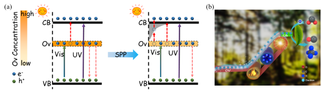 ▲圖4. (a)光催化電子空穴分離機(jī)理示意圖;(b)熱輔助太陽光下電子轉(zhuǎn)移示意圖。