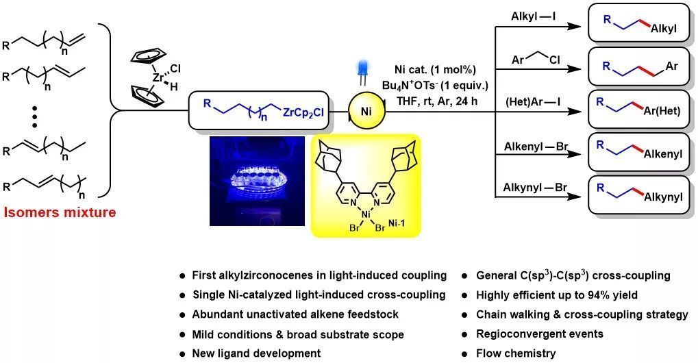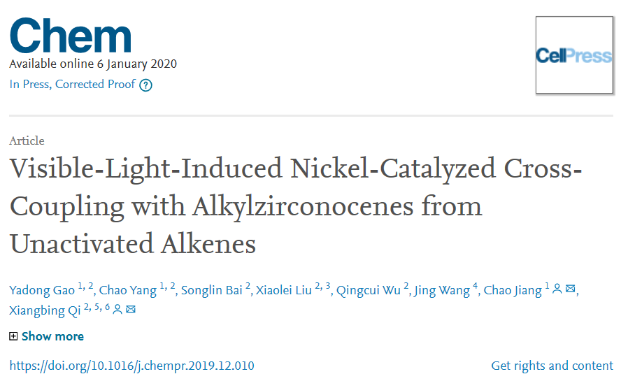 2020年1月6日,南京理工大學化工學院姜超研究團隊在Cell press旗下化學旗艦期刊《Chem》雜志在線發表了題為“Visible-light-induced Nickel-catalyzed Cross-coupling with Alkylzirconocenes from Unactivated Alkenes”的研究論文。作者首次發現了簡單可見光促進的并且是單一鎳催化的烷基鋯交叉偶聯方法,廣譜地實現了所有碳碳成鍵類型包括C(sp3)–C(sp3), C(sp3)–C(sp2)和C(sp3)–C(sp)的成功構建,本研究是烷基鋯試劑在交叉偶聯反應領域的首次突破性應用。