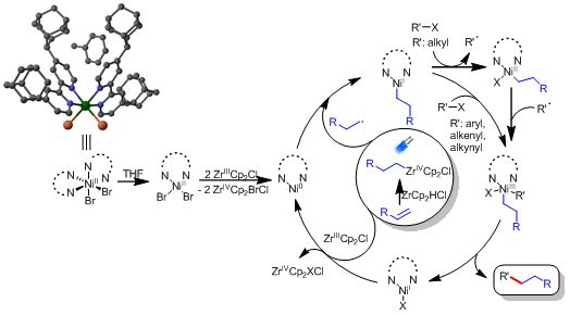 過渡金屬催化的交叉偶聯反應是現代有機合成領域構建碳碳鍵的最有效的方法之一,廣泛應用于藥物化學,材料科學,化工原料以及生物科學等領域。基于sp3碳中心的交叉偶聯反應是合成復雜三維非平面分子結構的重要手段,也是構建復雜天然產物和藥物分子的核心策略之一。2010年諾貝爾化學獎頒給了Richard F. Heck、Ei-ichi Negishi和Akira Suzuki三位有機合成化學家,以表彰他們在鈀催化的交叉偶聯反應方面的貢獻。有機化學教科書上關于有機金屬試劑參與的交叉偶聯反應或者基于有機金屬試劑的偶聯人名反應都或多或少存在缺陷,譬如Negishi反應(基于有機鋅試劑,難以合成和操作繁瑣)、Kumada反應(基于有機鎂試劑,非常活潑官能團耐受低,適用范圍窄)、Stille反應(基于有機錫試劑,難以合成并且毒性大)、Hiyama 反應(基于有機硅試劑,合成繁瑣,適用范圍小) 、Suzuki反應(基于有機硼試劑,合成繁瑣并且不能夠遠程遷移)等等。相比較而言,有機鋯試劑特別是烷基鋯試劑制備方便,可以由簡單豐富的烯烴與穩定易得的Schwartz試劑(氫氯二茂鋯)氫鋯化反應而得,官能團耐受性良好,并且具有沿烷基碳鏈進行“鏈行走”遠程遷移的特性。這種簡便特異的烷基鋯試劑被發現和合成表征半個多世紀以來,由于受到烷基鋯本身的親核特性與過渡金屬轉金屬化效率限制在交叉偶聯反應中的應用一直沒有被突破。