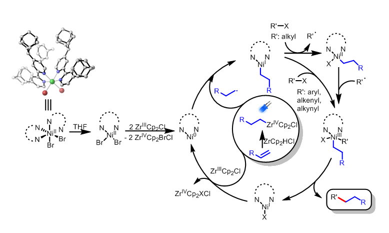 過渡金屬催化的交叉偶聯反應是現代有機合成領域構建碳碳鍵的最有效的方法之一,廣泛應用于藥物化學,材料科學,化工原料以及生物科學等領域?;趕p3碳中心的交叉偶聯反應是合成復雜三維非平面分子結構的重要手段,也是構建復雜天然產物和藥物分子的核心策略之一。2010年諾貝爾化學獎頒給了RichardF. Heck、Ei-ichiNegishi和AkiraSuzuki三位有機合成化學家,以表彰他們在鈀催化的交叉偶聯反應方面的貢獻。有機化學教科書上關于有機金屬試劑參與的交叉偶聯反應或者基于有機金屬試劑的偶聯人名反應都或多或少存在缺陷,譬如Negishi反應(基于有機鋅試劑,難以合成和操作繁瑣)、Kumada反應(基于有機鎂試劑,非常活潑官能團耐受低,適用范圍窄)、Stille反應(基于有機錫試劑,難以合成并且毒性大)、Hiyama反應(基于有機硅試劑,合成繁瑣,適用范圍小)、Suzuki反應(基于有機硼試劑,合成繁瑣并且不能夠遠程遷移)等等。相比較而言,有機鋯試劑特別是烷基鋯試劑制備方便,可以由簡單豐富的烯烴與穩定易得的Schwartz試劑(氫氯二茂鋯)氫鋯化反應而得,官能團耐受性良好,并且具有沿烷基碳鏈進行“鏈行走”遠程遷移的特性。這種簡便特異的烷基鋯試劑被發現和合成表征半個多世紀以來,由于受到烷基鋯本身的親核特性與過渡金屬轉金屬化效率限制在交叉偶聯反應中的應用一直沒有被突破。