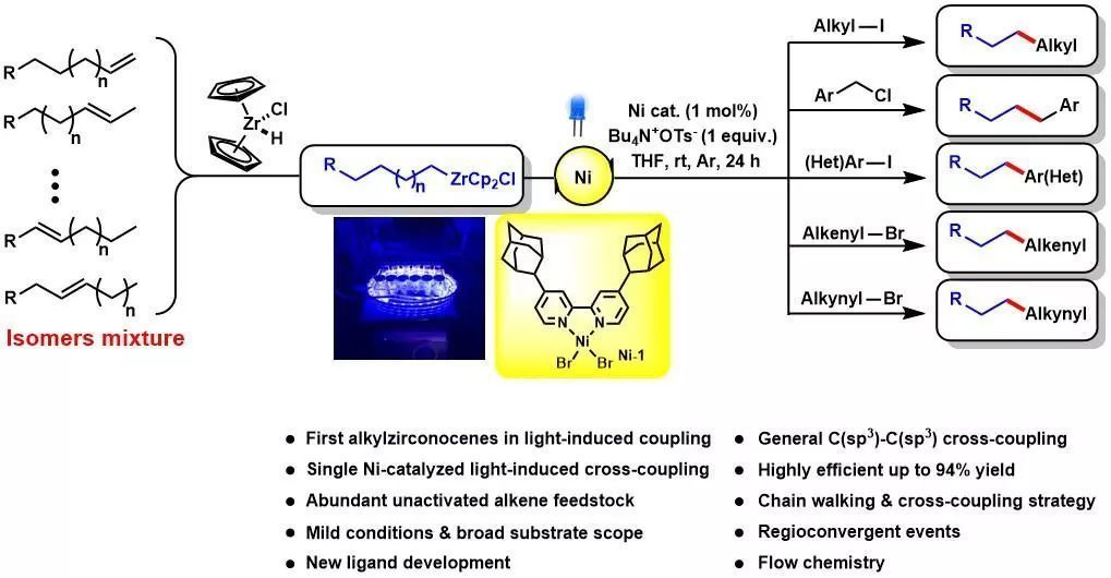 2020年1月6日,北京生命科學研究所/清華大學生物醫學交叉研究院齊湘兵課題組在Cell Press旗下化學旗艦期刊《Chem》雜志在線發表了題為“Visible-light-induced Nickel-catalyzed Cross-coupling with Alkylzirconocenes from Unactivated Alkenes”的研究論文。作者首次發現了簡單可見光促進的并且是單一鎳催化的烷基鋯交叉偶聯方法,廣譜地實現了所有碳碳成鍵類型包括C(sp3)–C(sp3),C(sp3)–C(sp2)和C(sp3)–C(sp)的成功構建,是烷基鋯試劑交叉偶聯反應領域的首次突破性應用。