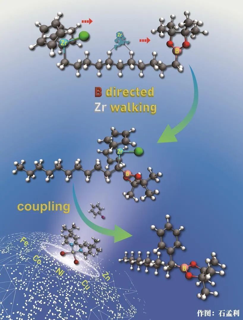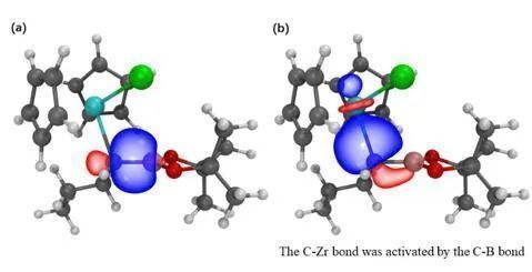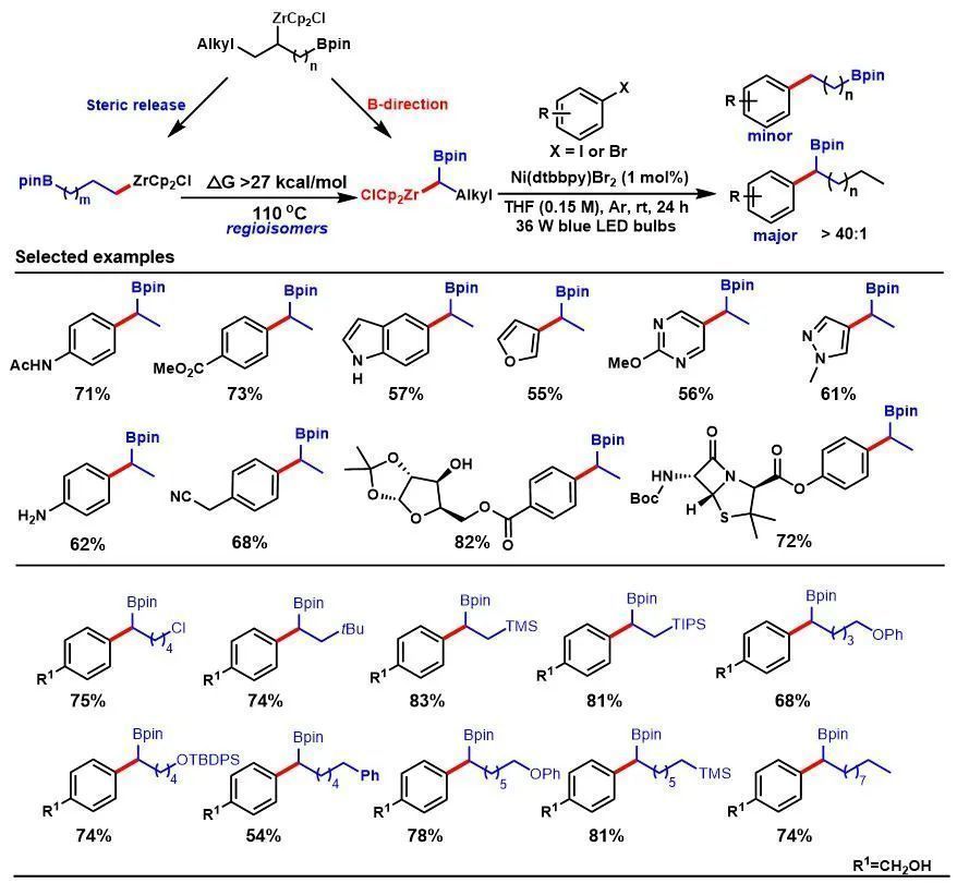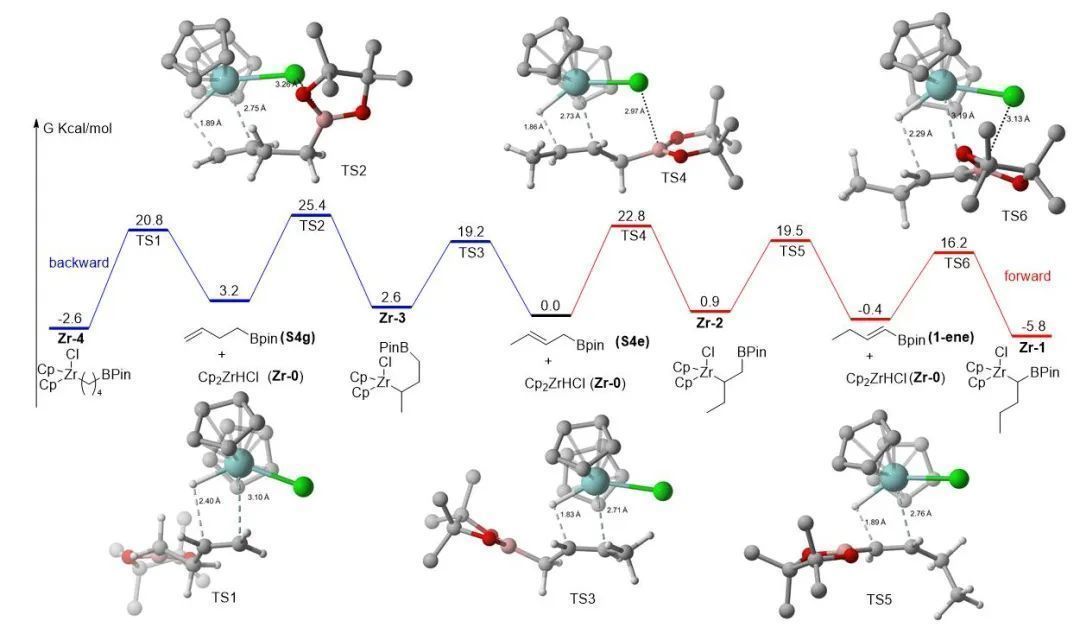 烷基鋯試劑具有“鏈行走”遠程遷移特點,但是鋯試劑遠程遷移通常生成熱力學穩定的端頭一級鋯試劑,而由熱力學穩定的一級鋯試劑通過“鏈行走”遠程“逆遷移”生成二級烷基鋯試劑并沒有被發現。該研究團隊首次實現了通過端位硼酸酯基團誘導鋯試劑選擇性遠程遷移方向的控制,成功實現了一級鋯試劑遠程逆遷移生成二級烷基鋯硼試劑的過程。作者還通過DFT 計算具體探索了硼酸酯導向鋯試劑遷移的詳細過程,解析了烷基鋯硼試劑穩定性及其高反應活性的原因。