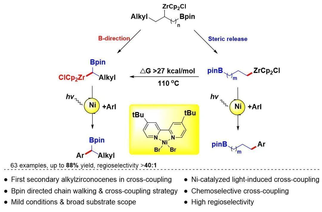 2020年6月5日,北京生命科學研究所/清華大學生物醫學交叉研究院齊湘兵課題組在化學頂級期刊《J. Am. Chem. Soc.》雜志在線發表了題為“Chemoselective Cross-coupling of gem-Borazirconocene Alkanes with Aryl Halides” 的研究論文(https://pubs.acs.org/doi/abs/10.1021/jacs.0c03821)。有機鋯試劑在烷烴長鏈上行走(“鏈行走”)并活化遠端化學鍵特性被發現近半個世紀來(1974年),如何控制鋯金屬的選擇性遷移,遷移方向以及如何活化烷烴端頭單鍵等科學問題一直沒有被解決。作者首次發現了烷基鋯遠程遷移的可控性,實現了硼酸酯對鋯試劑“鏈行走”遠程遷移的導向控制,高效構建了同碳鋯硼物種。在此基礎上,作者進一步開發了簡單可見光促進鎳催化的烷基鋯硼試劑與芳基鹵化物交叉偶聯方法,實現了具有手性中心的二級烷基硼試劑的高效合成。本研究是該科研團隊在突破可見光促進單一鎳催化的烷基鋯交叉偶聯反應后的又一新的方向(https://doi.org/10.1016/j.chempr.2019.12.010,Chem2020, 6, 675-688)。