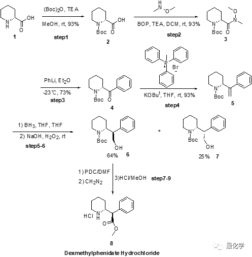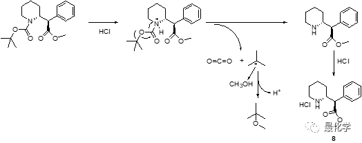 最后,Boc酸酐保護的右哌醋甲酯在氯化氫(HCl)甲醇溶液中脫去Boc保護基,生成目標產(chǎn)物鹽酸右哌醋甲酯8。