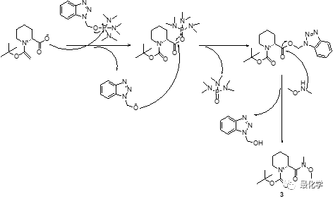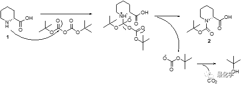 哌可啉酸1和Boc酸酐反應,得到N-Boc保護的哌可啉酸2,該步將化合物1結構的活性反應點(仲胺)鈍化,為后續(xù)的step2酰胺化做準備,避免自身酸胺縮合副反應。