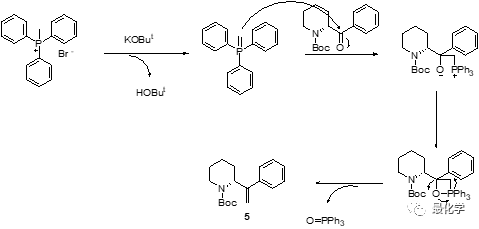 Step4是一步wittig反應,即有機酮化合物在磷葉立德作用下生成烯烴。該步反應中,甲基三苯基磷溴化物在親核試劑叔丁醇鉀作用下生成了膦葉立德。磷葉立德P=C結構碳端呈現(xiàn)負電性,具有親核性,進攻中間體4的羰基,經(jīng)過[2+2]四元環(huán)加成過渡態(tài)生成目標產(chǎn)物中間體5和副產(chǎn)物三苯基氧磷。