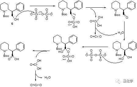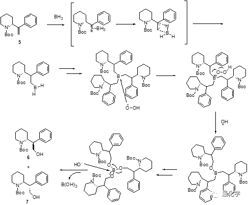 中間體5經(jīng)過硼氫化氧化之后,得到赤式(右旋)和蘇式(左旋)兩種光學構型的中間體6和7。由于赤式(右旋)構型合成得到的右哌醋甲酯鹽酸鹽的生理活性更好,所以目標藥物優(yōu)選結構6進行進一步的醇氧化,合成羧酸。