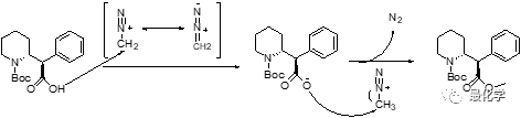 PDC是一種中性的氧化劑,其在氧化過程中一般不會對烯烴雙鍵和酸性敏感結構產(chǎn)生影響。但是,PDC在氧化過程中會生成黑色的二氧化鉻(CrO2),有可能會吸附包裹產(chǎn)物,從而不便后處理,影響收率。一般可以向反應中添加硅膠、硅藻土和分子篩來吸附生成的二氧化鉻,改善反應收率和后處理。由于PDC氧化劑中含有重金屬鉻,使用PDC不可避免地會引入重金屬,對人體產(chǎn)生潛在地健康危害,所以在藥物合成中,PDC氧化被其他的氧化方法所取代。6經(jīng)過PDC氧化后生成地羧酸中間體和重氮甲烷反應,將羧酸甲基化,生成甲酯結構。